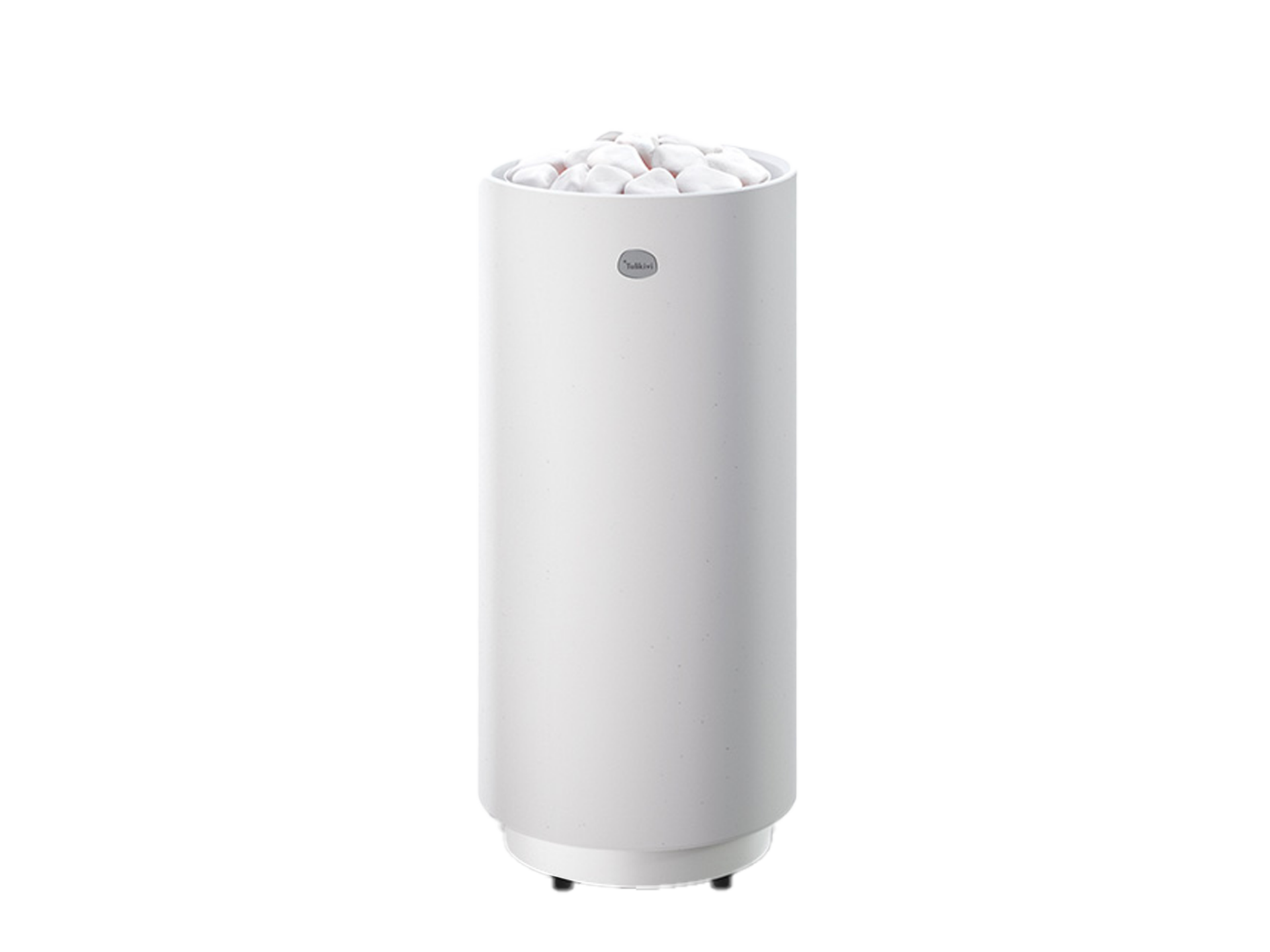 Skulpturel eksklusiv saunaovn udført i hvid keramik.
